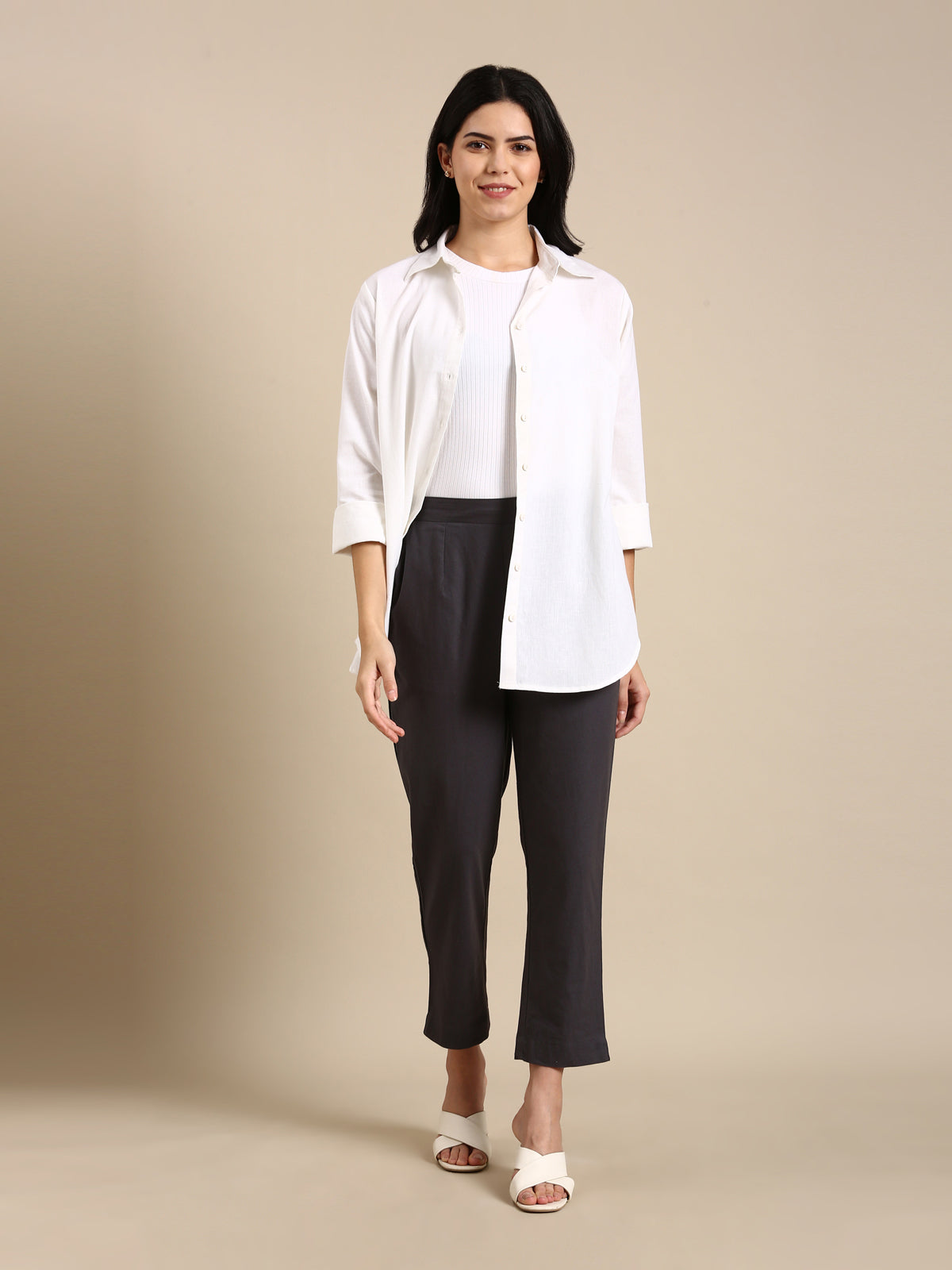 Designed with a regular fit and mid-rise waist, they offer a flattering silhouette that complements all body types. The pleated front and wide-leg cut add a touch of sophistication, while the half-elasticated waistband allows for easy movement and all-day wear.